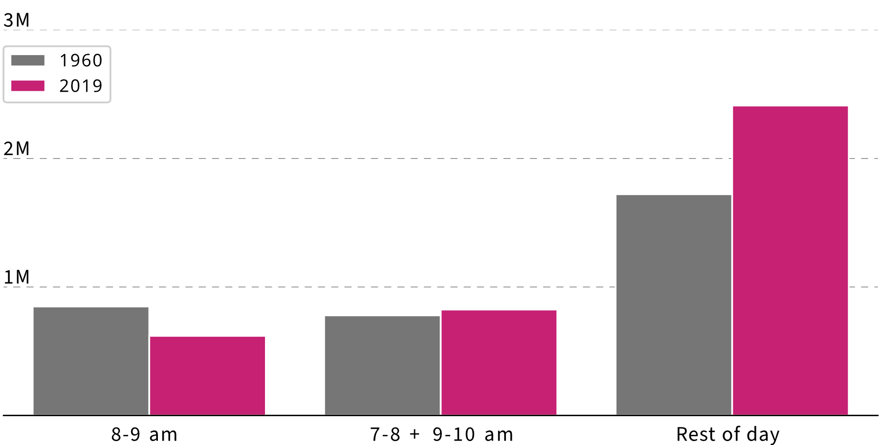 But we don’t live in this world anymore. Peak hour commuting has been declining since the 1960s while off-peak and non-work travel has risen.