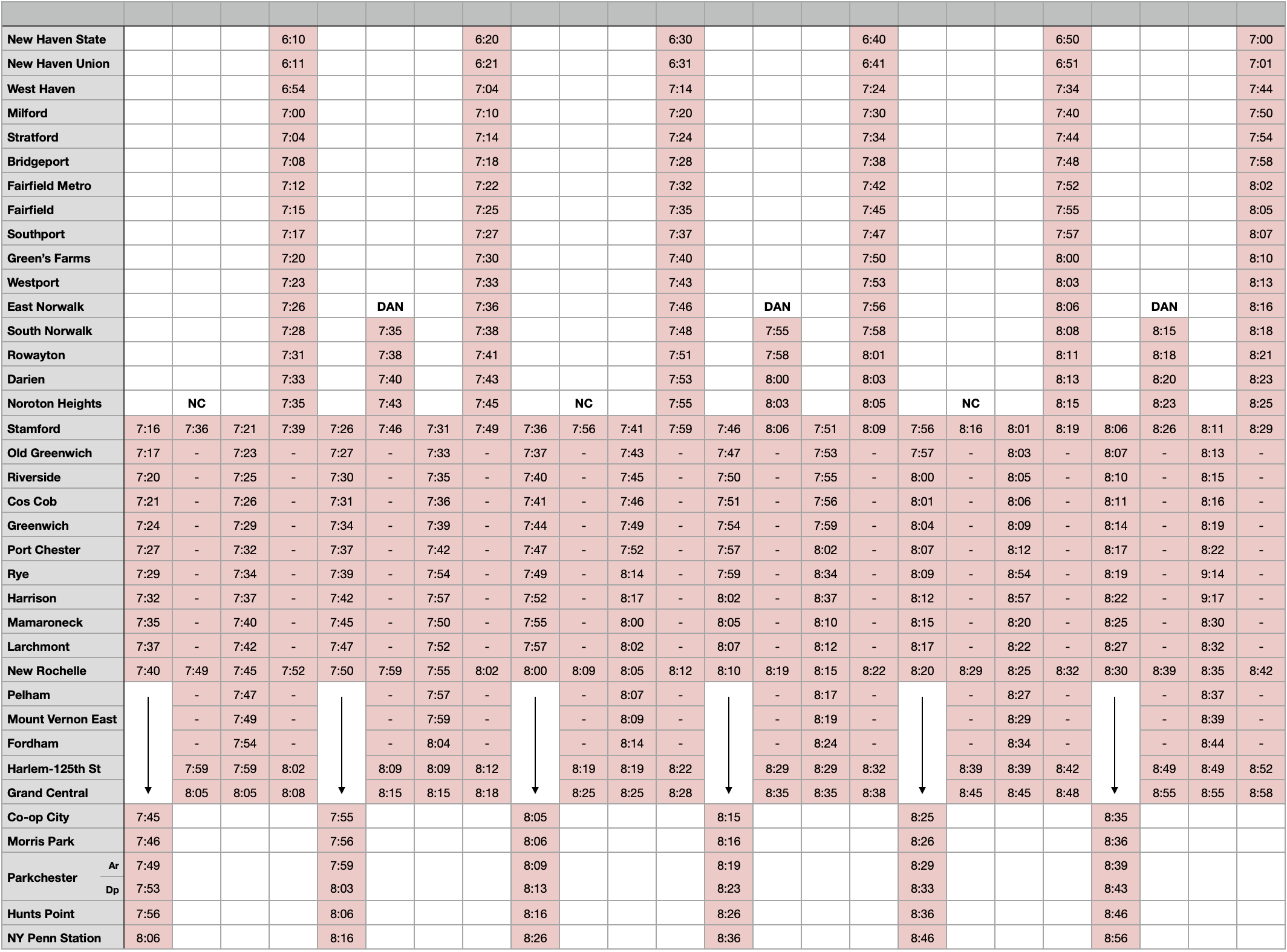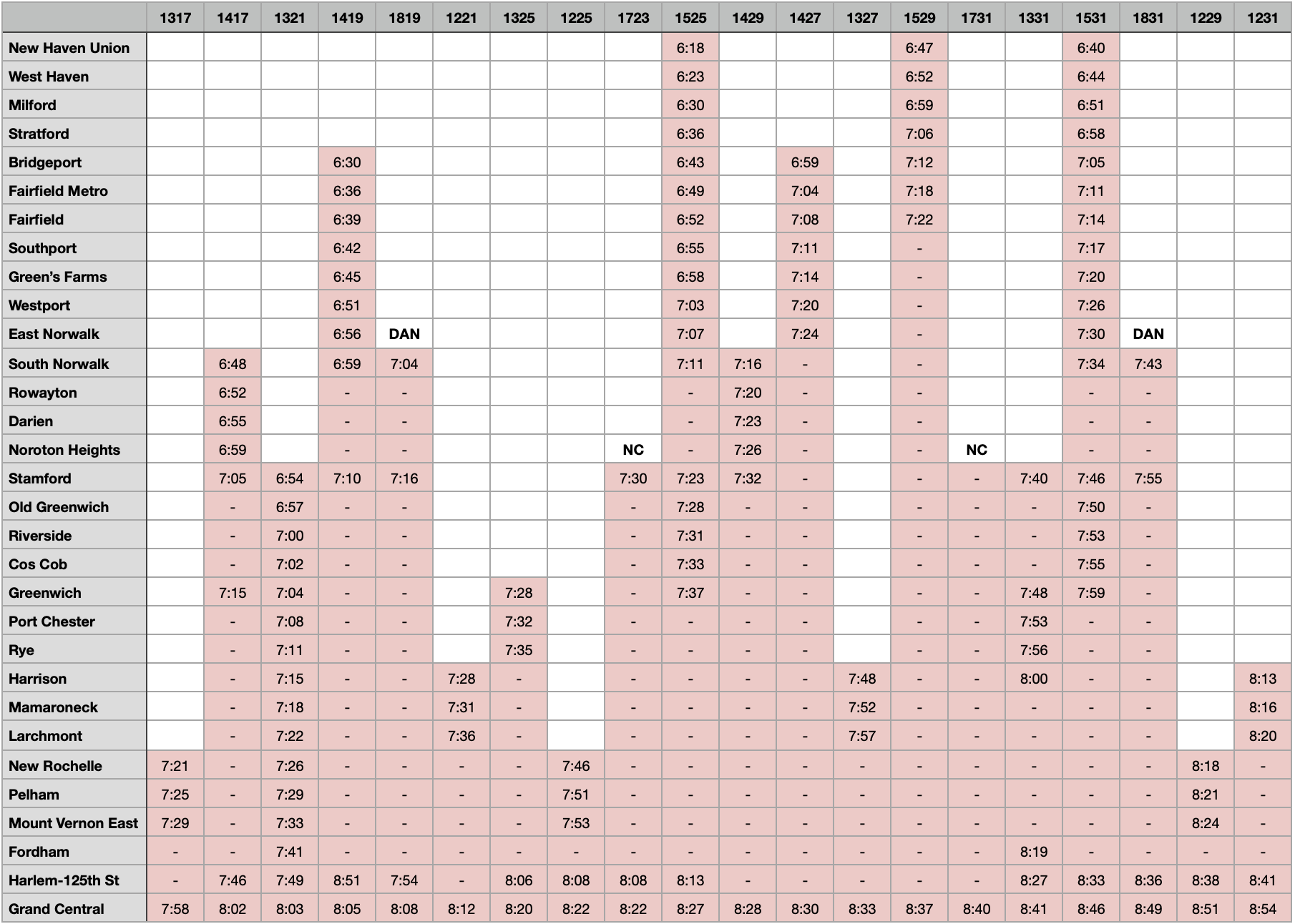 Current New Haven Line schedule, showing all the different stopping patterns at rush hour, highlighting that not counting the branches there are 13 of them